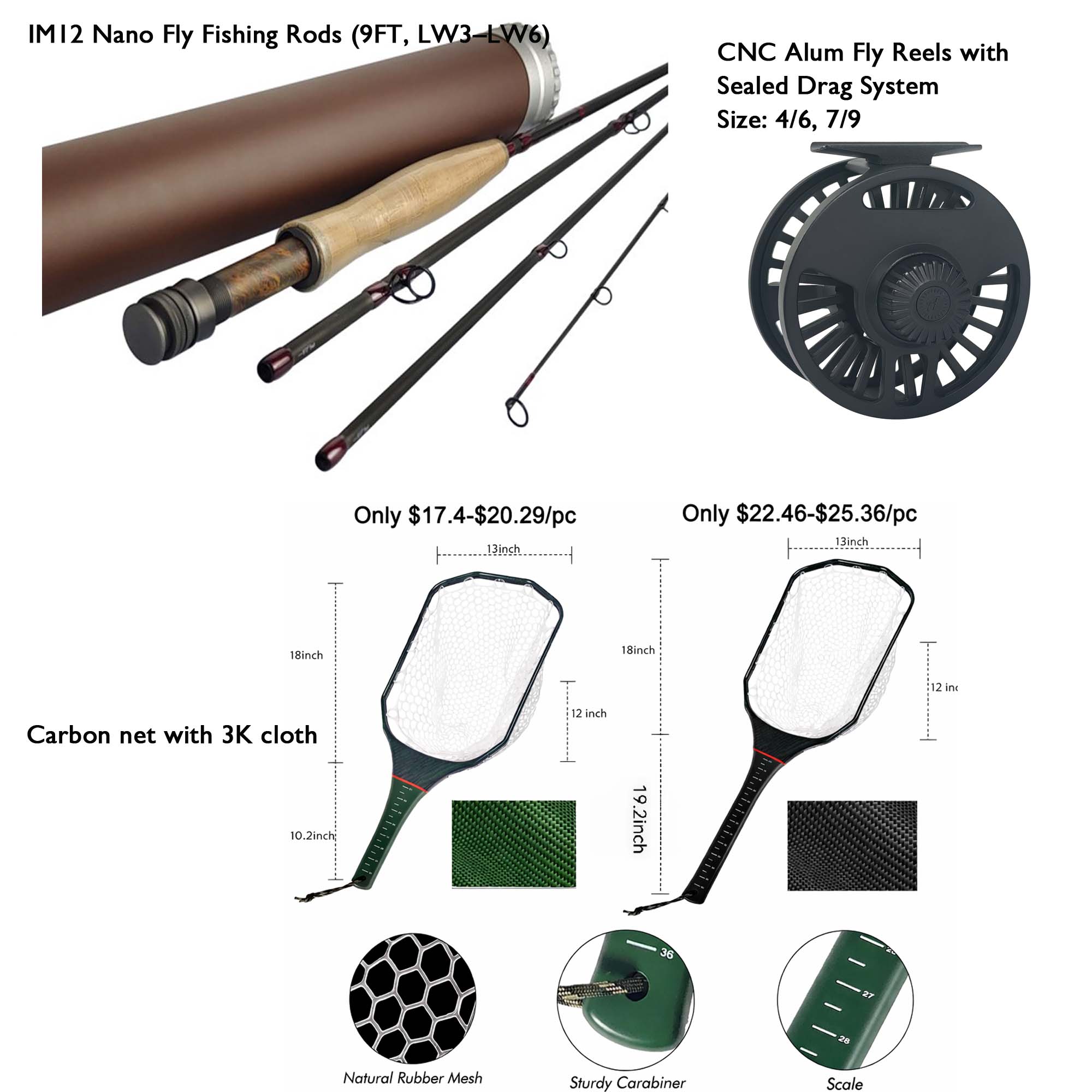 Ultra-light 3K cloth carbon fiber construction, strong and reliable for catch-and-release fishing.